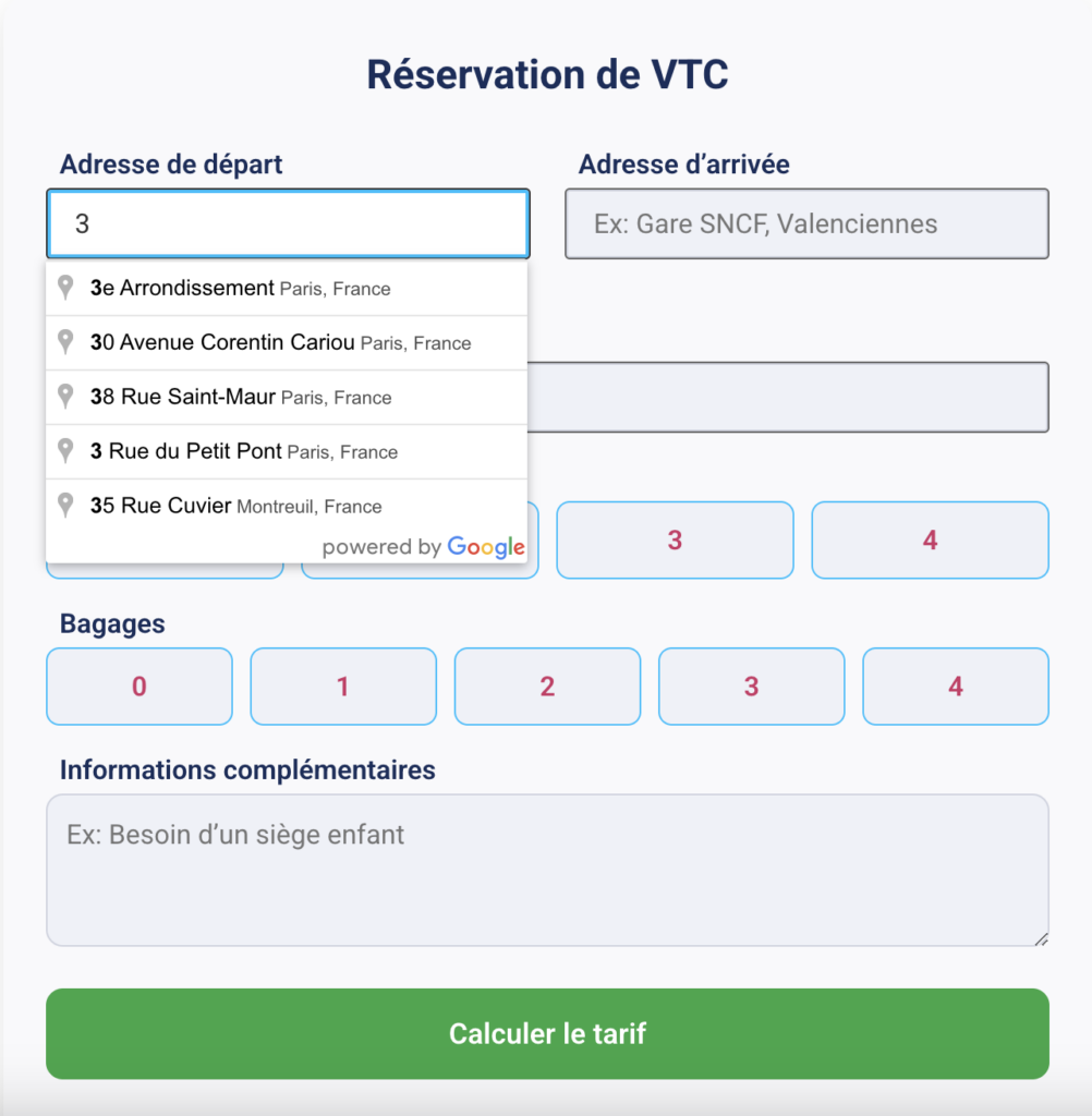 Dans la version 1.0, le client devait taper manuellement toute l’adresse. Désormais, grâce à l’autocomplétude Google :